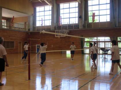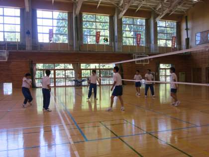 午後の「先輩に学ぶ講演会」のバレーボール体験に向けて、体を慣らしていました。気持ちが高まります。