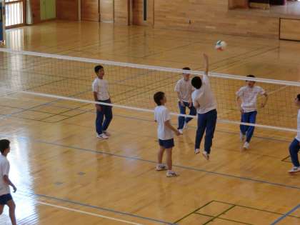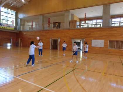 バレーボールまとめの授業です。グループで円陣パスのウォーミングアップ、そして、ゲームです。