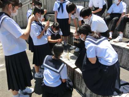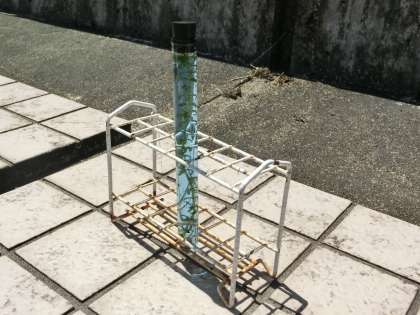 試験管に水草(オオカナダモ)を入れ、BBT溶液を注ぎます。日光を当てると酸性(黄色)だった溶液がアルカリ性(青色)に変化します。この実験から植物が光合成するために酸性からアルカリ性に変化することが分かります。