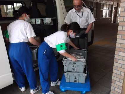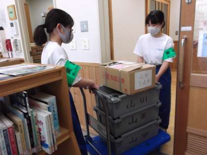 「社会に学ぶ『14歳の挑戦』」2日目です。今日は回送車から予約された本を受け取り、図書館に運ぶ仕事を手伝いました。このような過程を経て、読みたい本が山田まで届くのですね。頑張っています。