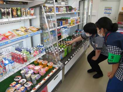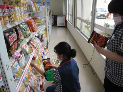 その後、指導ボランティアさんから、陳列方法について教えていただきながら陳列作業に取り組みました。
