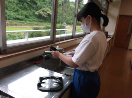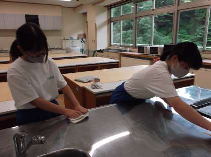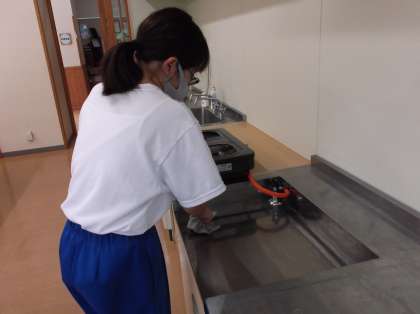 今日は山田図書館の休館日なので、図書館で挑戦を行っている生徒は、中学校へ登校し活動しました。学校での活動として、1限は、調理室の調理台やコンロ台を念入りに掃除しました。最後に拭き上げを行い、調理台に輝きが戻りました。頑張りました。