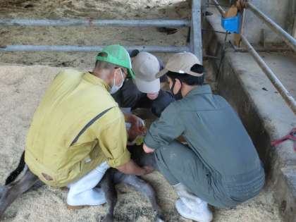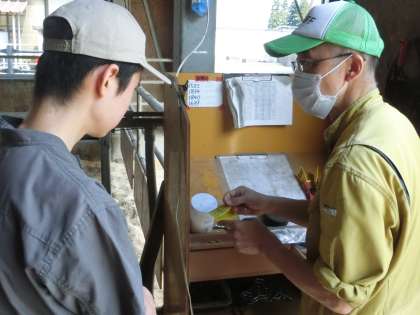 今日は子牛に餌をあげたり、生まれたばかりの子牛に個体識別番号札を取り付ける作業の手伝いをしたりしていました。作業にずいぶんと慣れてきたようです。