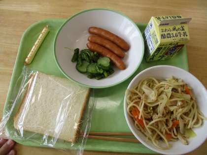 今日の給食は、食パン(減)、牛乳、ツナとキャベツのスパゲッティ、あらびきウィンナー、アスパラサラダ、棒チーズでした。