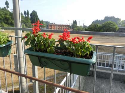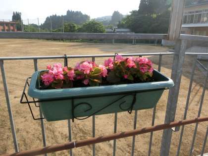 おはようございます。朝日を浴びたプランターの花です。
