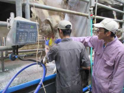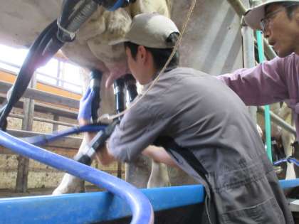 「14歳の挑戦」もいよいよ大詰めです。今日は搾乳を体験しています。安全のため、消毒してから搾乳機を取り付けます。