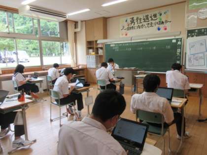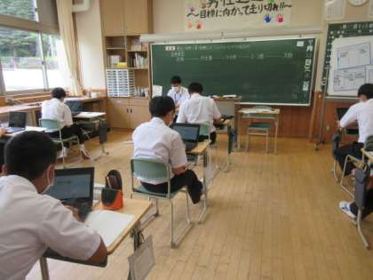 今日の課題は、「現在の生物と昔の生物にはどのようなつながりがあるか」です。魚類→両生類→は虫類→ホニュウ類→鳥類の順に出現した理由を、端末で調べています。