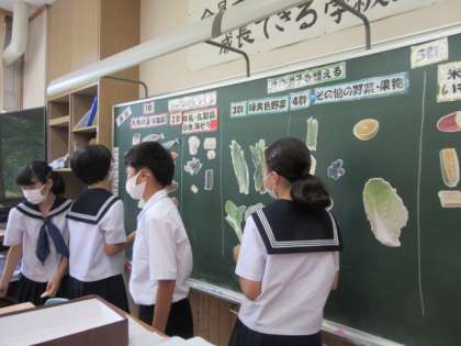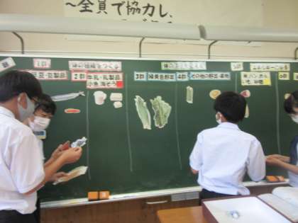 今日は6つの基礎食品群の復習をしました。中学校では、既習の「赤・黄・緑」の3つの食品群が6つに細分化され、より詳しく栄養等について学習します。