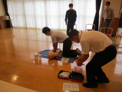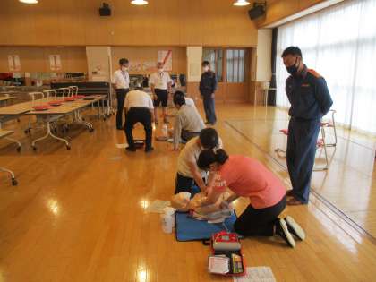 婦中消防署山田分遣所から講師の方をお招きし、救命救急講習会を行いました。突然の体調異変や食物アレルギーによるアナフィラキシー等が発生した場合に備え、心肺蘇生法やAEDの使用、エピペンの打ち方について、実際に体験しながら学びました。