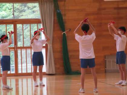 6限は、団活動でした。朱雀団、白虎団とも、少人数に分かれ、3年生の指導のもと、応援の振り付け練習を行いました。朱雀団は、早速小道具を持ちながら、白虎団は、端末で動画を確認しながら、それぞれ進めていました。