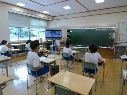 1年生は、英語の授業に取り組んでいます。予行練習後のためか、やや疲れているように見えましたが、教科書にある紹介文について、先生からの質問に積極的に答えています。