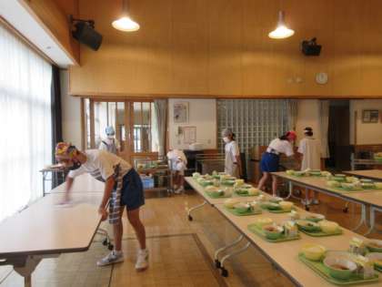 今日は、運動会の予行練習が長引いたため、予定の時間より遅れていたにも関わらず、給食当番全員がテキパキ仕事をしてくれたので、いつも通りの時間に給食準備が終わりました。片付けまでしっかりと行っていました。