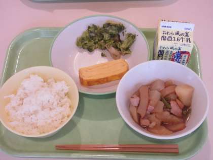 今日の給食は、ごはん、牛乳、厚焼き卵、ブロッコリーとエリンギのソテー、大根と鶏肉の煮込みでした。