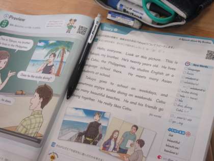 1年生は、英語の授業で第3者について説明する言い方「三人称単数現在形(三単現)」について学びました。英語を身に付けていく上で、とても大切な文法です。難しいとよく言われる文法ですが、様々な場面に応じた表現で時間をかけて学んでいきます。