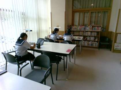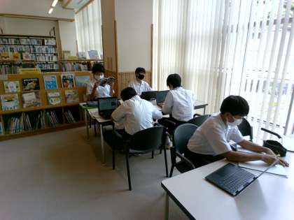 山田図書館で文献等を探し、伝統工芸について調べています。図書館司書の方に、伝統工芸についての参考文献を紹介してもらいました。生徒たちの学習のために、助けていただいています。