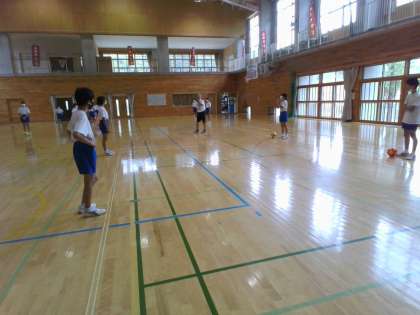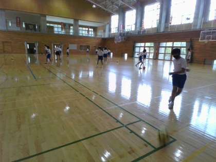 1、2年生は、体育の授業で、フットサルに取り組んでいます。様々なペアで、パスを正確に出す練習をしています。
