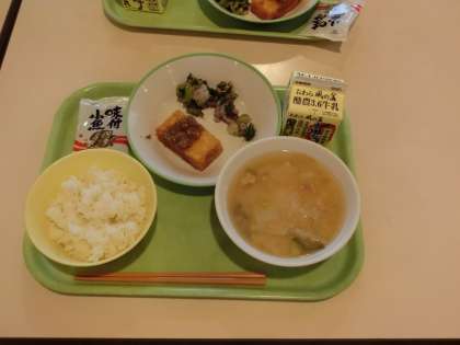 今日の給食は、ごはん、牛乳、揚げ出し豆腐のごまだれかけ、ゆかり和え、豚汁、味付け小魚でした。