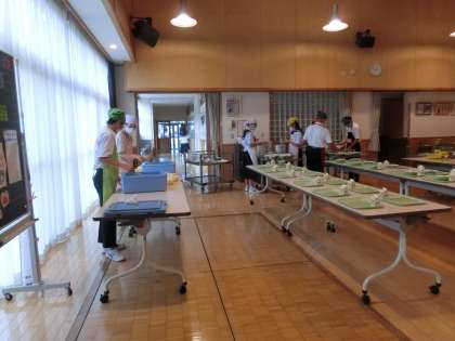 給食当番は、今日も周りを見て考えながら、全校分の配膳をしています。