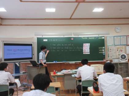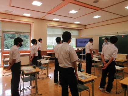 3年生は、英語の授業でした。1年生で学んだ表現を復習したあと、新しい表現を学び作文練習をしました。新しい表現の使い方が理解でき、うれしそうな表情が見られました。