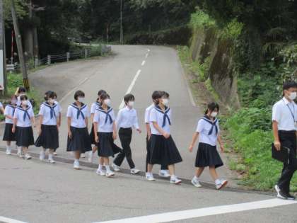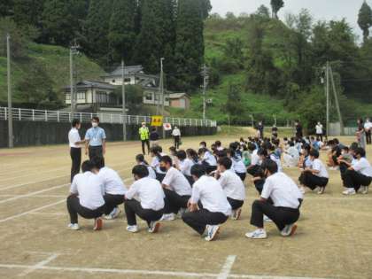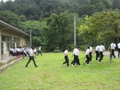 給食室(厨房)からの出火を想定した小中合同避難訓練を行いました。生徒たちは、「お(押さない)は(走らない)し(しゃべらない)も(戻らない)」を守り、グラウンドに避難していました。