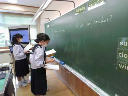 1年生は、英語の授業で、第3者がすることをたずねるために、「Does」の使った文について学習しました。それぞれが疑問文を黒板に書いて、文法の確認をしています。