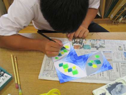 美術の授業では、ポスターカラーで彩色した用紙を、立方体に組み立てています。細かい部分を集中しながら彩色していたり、のぞき穴をつくって立方体に組み立てていたりと、作業は様々です。作品が飾られることが、今から楽しみです。