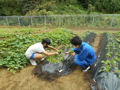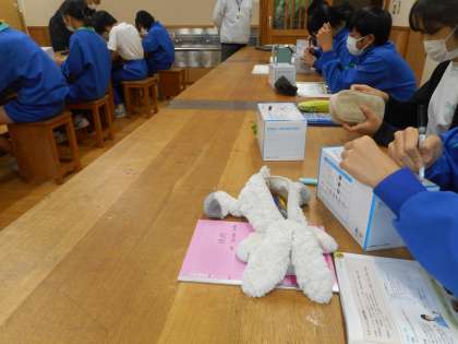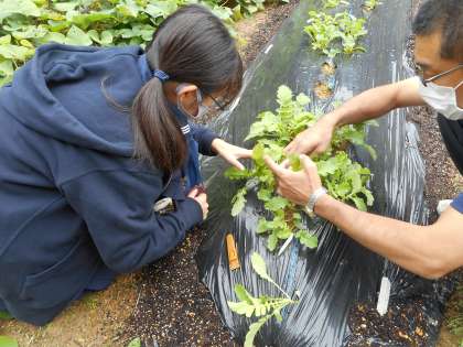 授業前半は、学校農園に出て3週間前に植えたダイコンの間引きをしました。後半は、技術室に戻り、来週の授業から組み立てるエコキューブラジオのセット内容の確認と説明を聞きました。