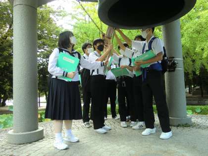 広島平和記念公園・原爆資料館での様子です。碑めぐりガイドさんから広島原爆に関する説明を聞き、生徒たちは、戦争があった歴史に真剣に向き合っていました。