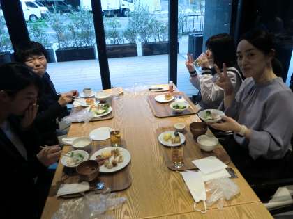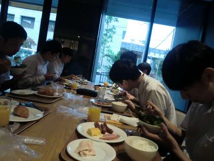 2日目の朝食場面での様子です。全員が予定した時刻に起床できました。朝食はビュッフェです。班別学習に向けてたくさん食べました。
