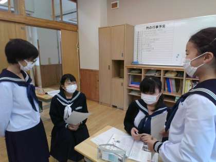 1年生は、道徳で、「ごみ箱をもっと増やして」という教材を読み、互いの考えを伝え合う活動を行いました。話合いで、観光地にごみ箱が設置されていると便利だという意見が出た一方、景色と合わないのでたくさん設置するのはよくないという意見も出ました。