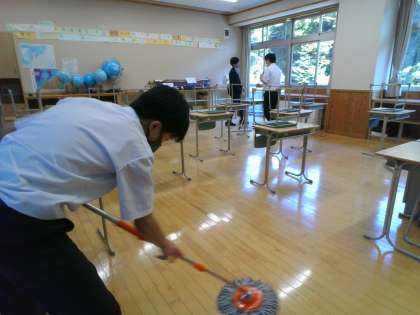 清掃の時間は、少ない人員で学校中の場所を掃除しています。手を止めず活動し、分担場所をきれいにして、全員で校舎の美化に努めています。