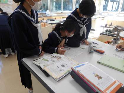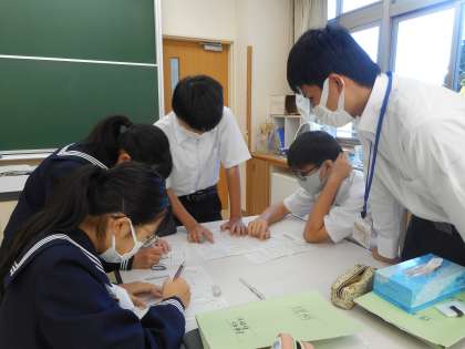 前時では、鏡で反射する光の道筋を実験で調べました。本日の授業は、光がつくる角度、入射角と反射角を、ワークシートで互いに確認しながら理解を深めます。