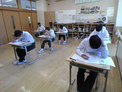 今日と明日の2日間で、3年生は確認テストに取り組みます。1限目の社会科のテストでは、これまでの勉強の成果を発揮しようと、一つ一つの問題をよく読み、集中して取り組んでいます。