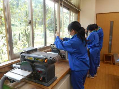 本日の学習課題は、「材料の表面を研磨しよう」です。製作中のラックの穴開け工程までを終え、本日は、面取りと材料の表面をなめらかにします。