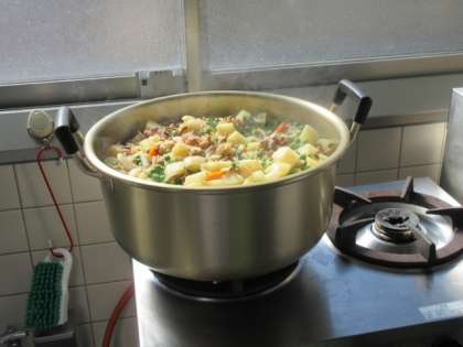 今日の給食は、ごはん、牛乳、いわしの土佐煮、もやしのおひたし、豚肉の南蛮煮、バナナです。今日は、小学校の先生方に研修会があるため、小学校は給食がなく、中学生のみでした。汁物や煮物は、いつも大きな釜で調理しますが、今日は鍋で煮込み、そのまま配膳しました。南蛮煮に入る一味唐辛子も、いつもより多めに入りました。