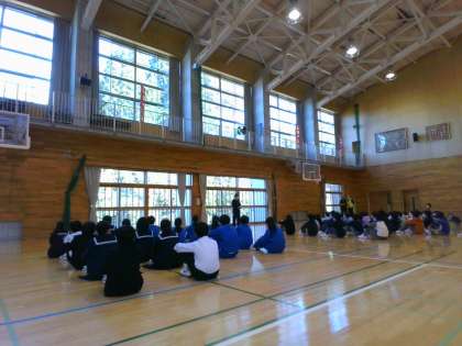 富山西警察署山田駐在所の中田所長様から、訓練の評価と不審者が実際に侵入してきたときの対応の仕方を聞き、いざというときの望ましい行動について真剣に考えていました。