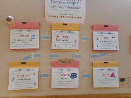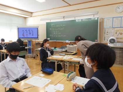 授業では、2人ペアになってカードを引き、そこに書かれている動作を互いに確認し、現在進行形(Are you ○○ing now?)を含んだの表現でやり取りします。