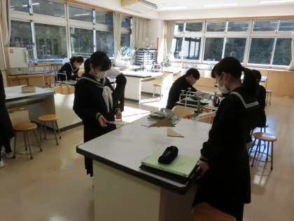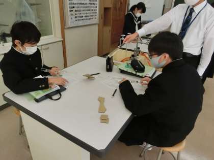 バネばかりの引き合い力の釣り合いについて、ペアで実験しています。