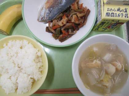 今日の給食は、ごはん、牛乳、茎わかめのきんぴら、さわらの塩焼き、具沢山汁、バナナでした。茎わかめのきんぴらは、れんこんと茎わかめのシャキシャキとした食感が楽しめます。