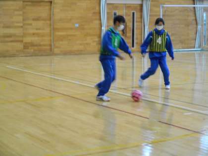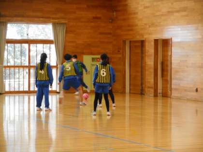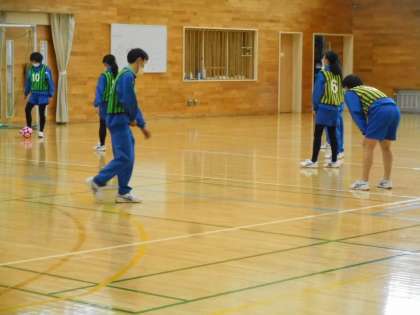 本日の授業は「フットサル」です。男女混合で、2チームに分かれゲーム形式で学習します。チームでパスをつなぎ、ゴールを目指します。