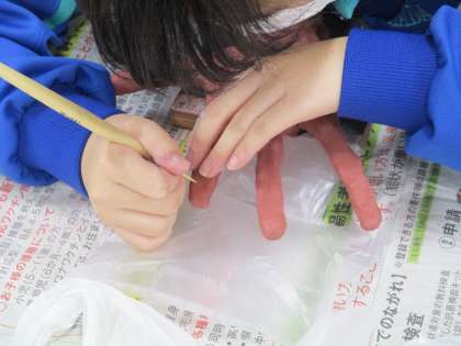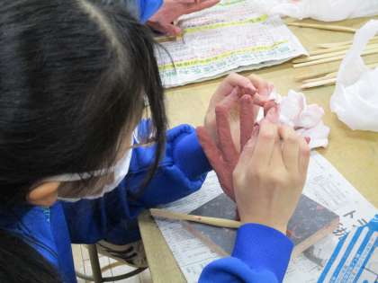 粘土ベラと指を使って、手の質感や動きを細部まで表現するため、見本となる自分の手と見比べながら、完成に近付けています。