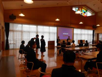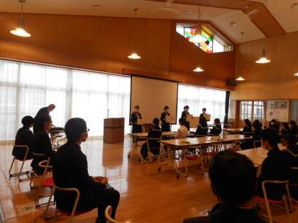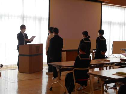 1限は、学期末の生徒集会です。最初に、生徒会執行部から山中アンケート結果報告と委員会からのお知らせがありました。続いて、受賞報告と、読書活動、家庭学習、学力向上アカデミーそれぞれでがんばった生徒が紹介され表彰されました。会場にいる全員の温かい拍手で讃えました。