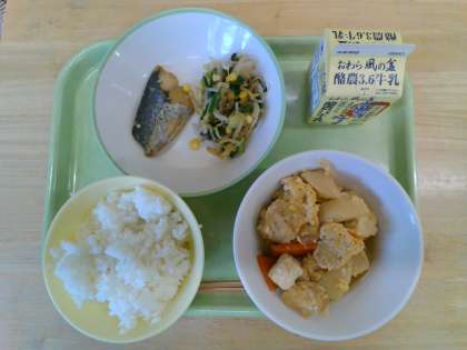 今日の給食の献立は、牛乳 ごはん 鰆の西京焼き コーン和え 厚揚げの卵とじです。鰆(さわら)は「 魚」偏に「春」と書きますが、「春を告げる魚」ということだそうです。