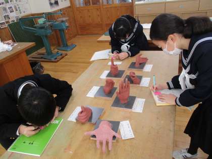 美術の授業では、2学期に制作した「手」の振り返りと作品鑑賞を行いました。作品で表現したかったことや制作中の感想等を振り返ります。また、互いの作品を見合いながら、友達の作品のよいところを書きました。