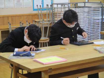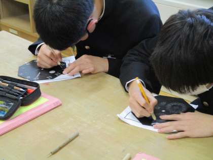 2学期に引き続き、卒業記念品となる八角時計の制作に取り組んでいます。美術室内では、板を削る音だけが響き、集中して進めています。