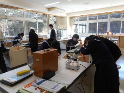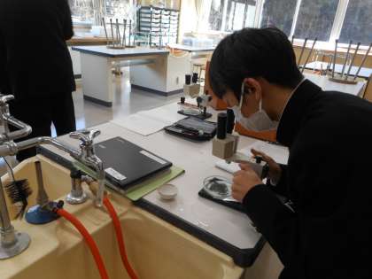 本日の学習は「火山灰は、どのような物でできているのか調べよう」です。火山灰の種類を変え、実験を繰り返します。生徒は、顕微鏡をのぞきながらスケッチすることに、慣れてきたようでした。