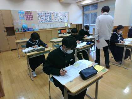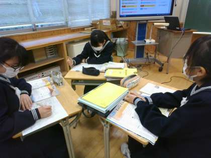 1年生の英語の授業では、「文章の詳細をつかもう」をテーマに、教科書の文章読解に取り組みました。読み取った情報をプリントに書き込みながら、内容を把握していました。その後、読み取った内容をグループで確認し合って理解を深めました。