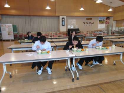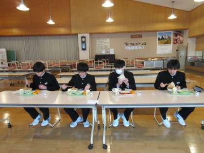 今日は小学校全学年、中学校1、2年生がスキー教室だったため、中学校3年生のみの給食です。新型コロナウイルス感染予防のため、いつもは教室で食べていますが、今日は久しぶりにランチルームで食べました。3年生が、広いランチルームで、給食を食べるのは今日が最後かもしれません。
