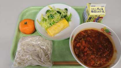 今日の給食は、ソフト麺のミートソース、牛乳、卵ロール、グリーンサラダ、みかんでした。