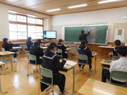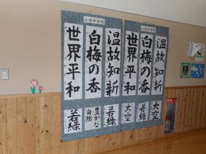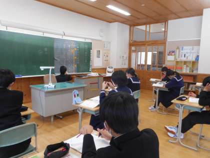 本日の授業は「用言の活用」です。用言の活用の仕方、動詞の活用の仕方や種類を覚えます。国語科教室前の廊下には、富山市中学校書写展覧会に出品された作品が掲示されています。